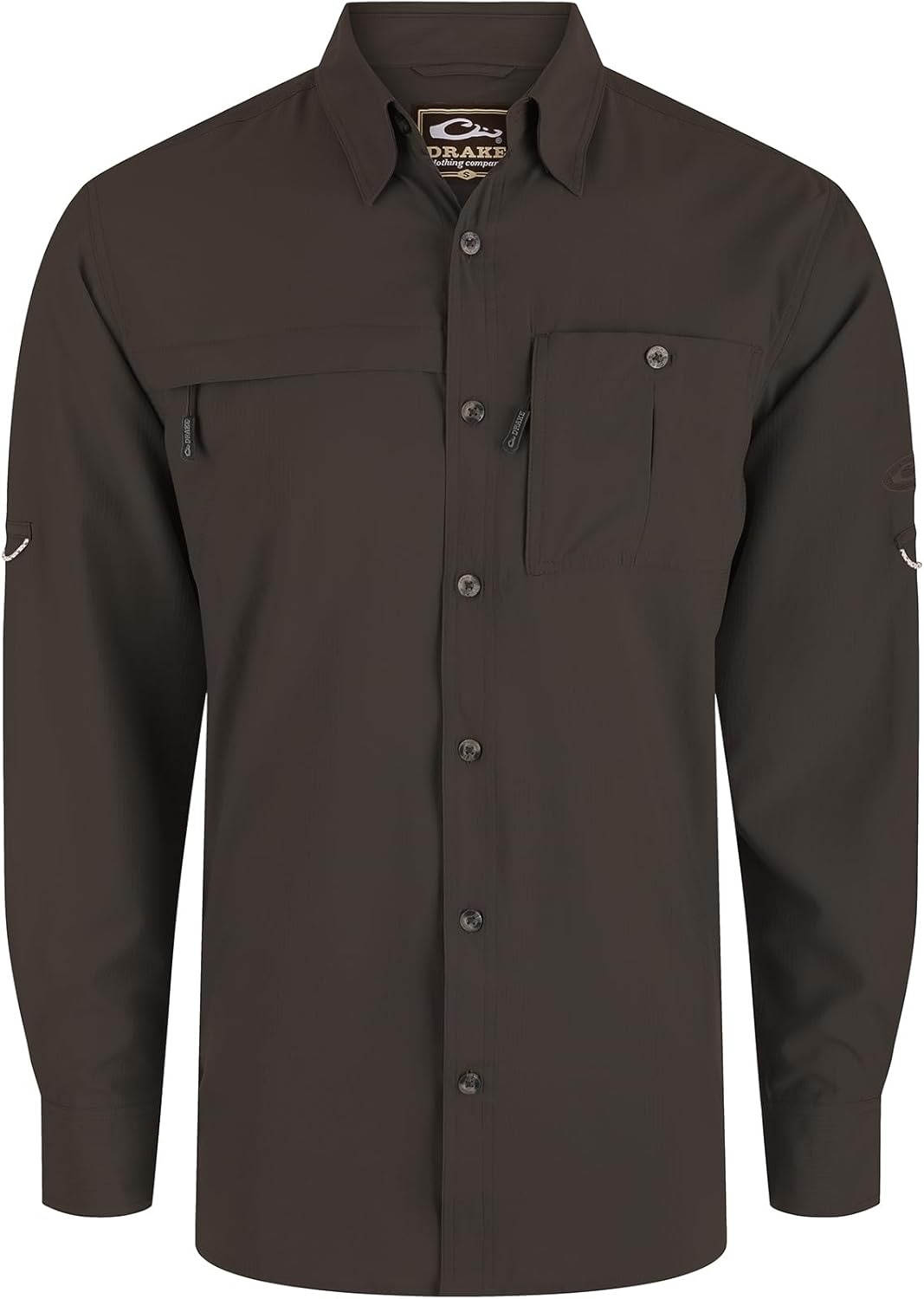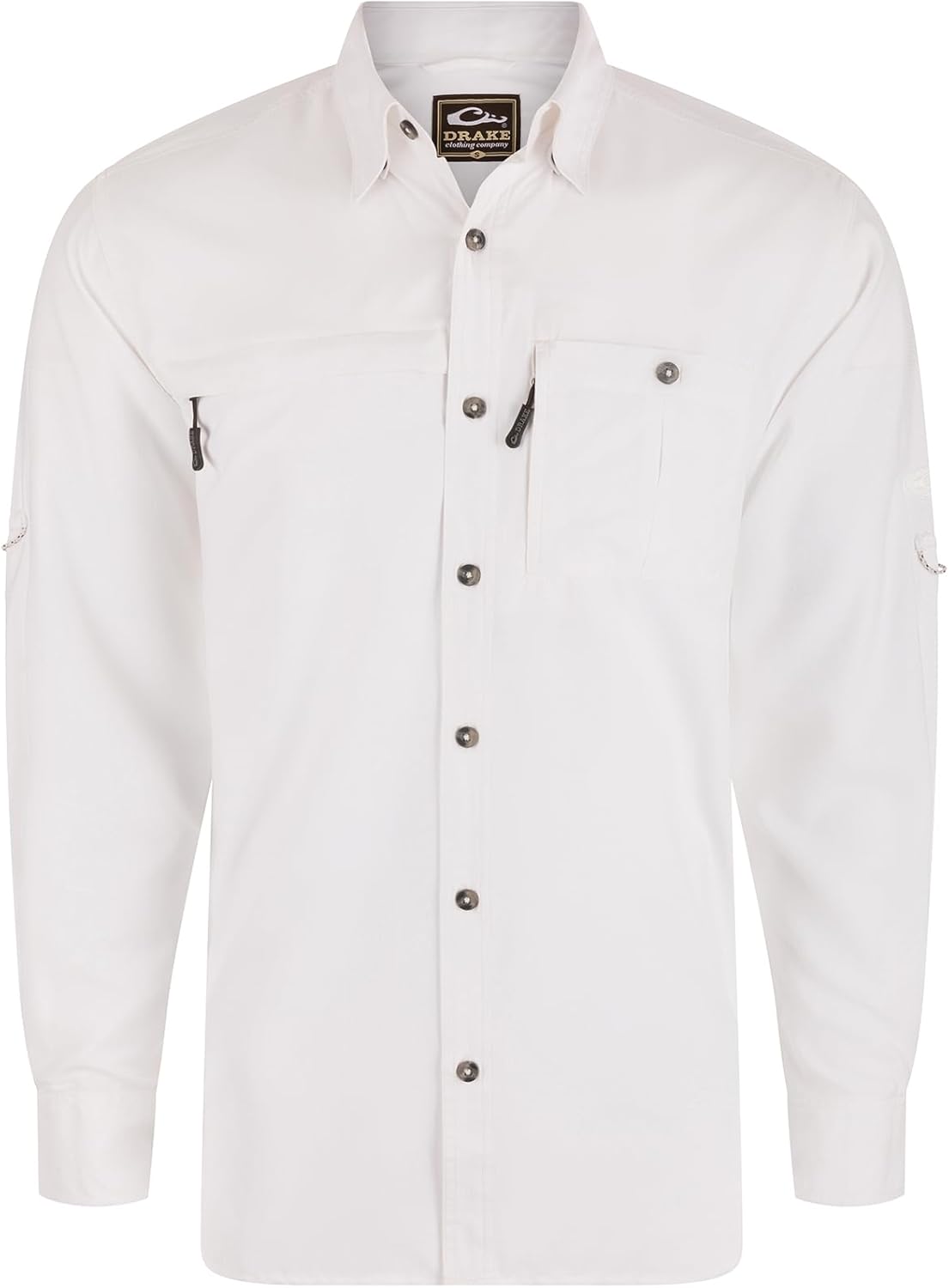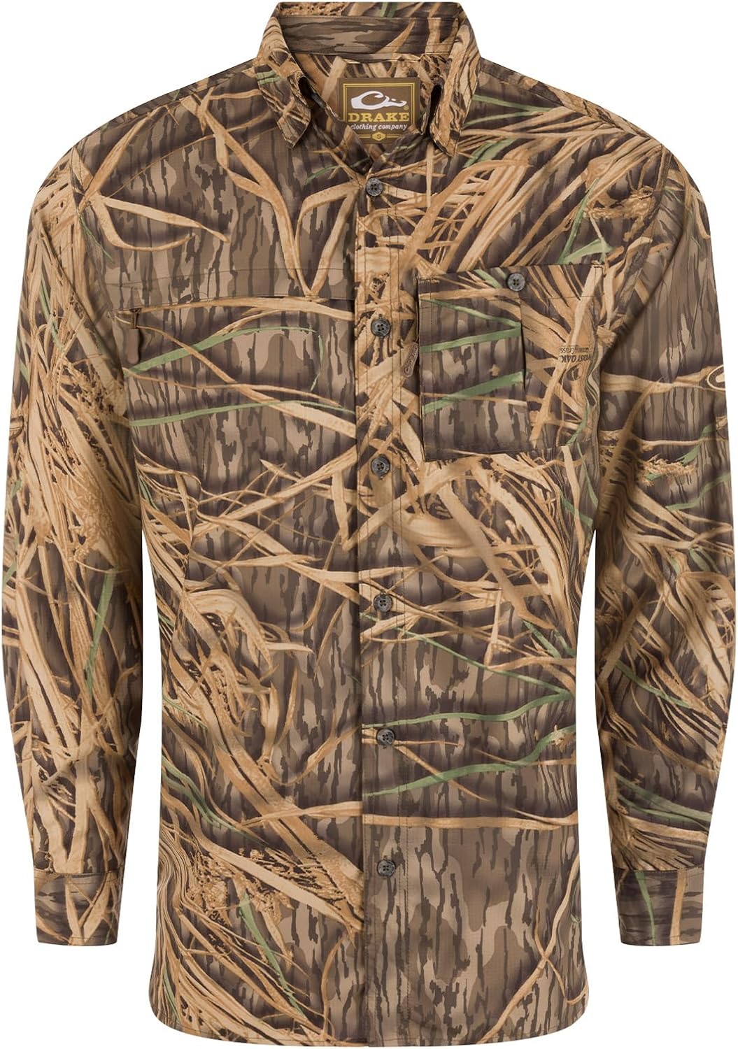 The Drake Long-Sleeved Camo Hunting Shirt, crafted from 100% Polyester Dobby fabric, showcases our exclusive Old School Camo pattern. This featherweight fabric (71 GSM) swiftly wicks moisture and offers UPF30 sun protection, along with natural stretch for ease of movement. It boasts a classic fit, hidden button-down collar, and vented cape back. Featuring a right chest pocket with a horizontal hidden zipper and a buttoned left chest pocket with a hidden vertical zipper, this shirt allows for tucked or untucked wear with an adjustable sleeve tab. Its classic styling and technical features make it a soon-to-be favorite.