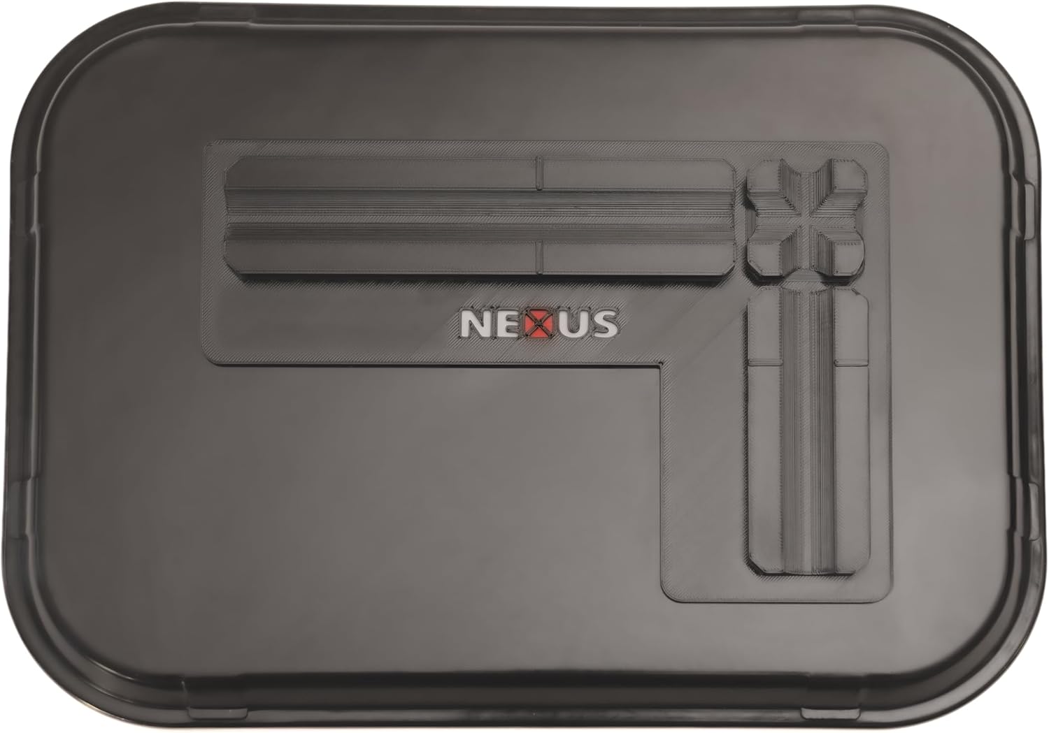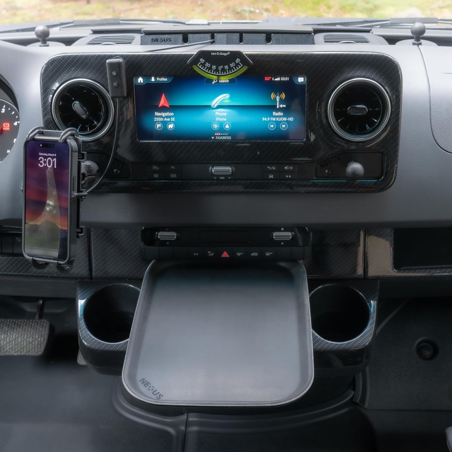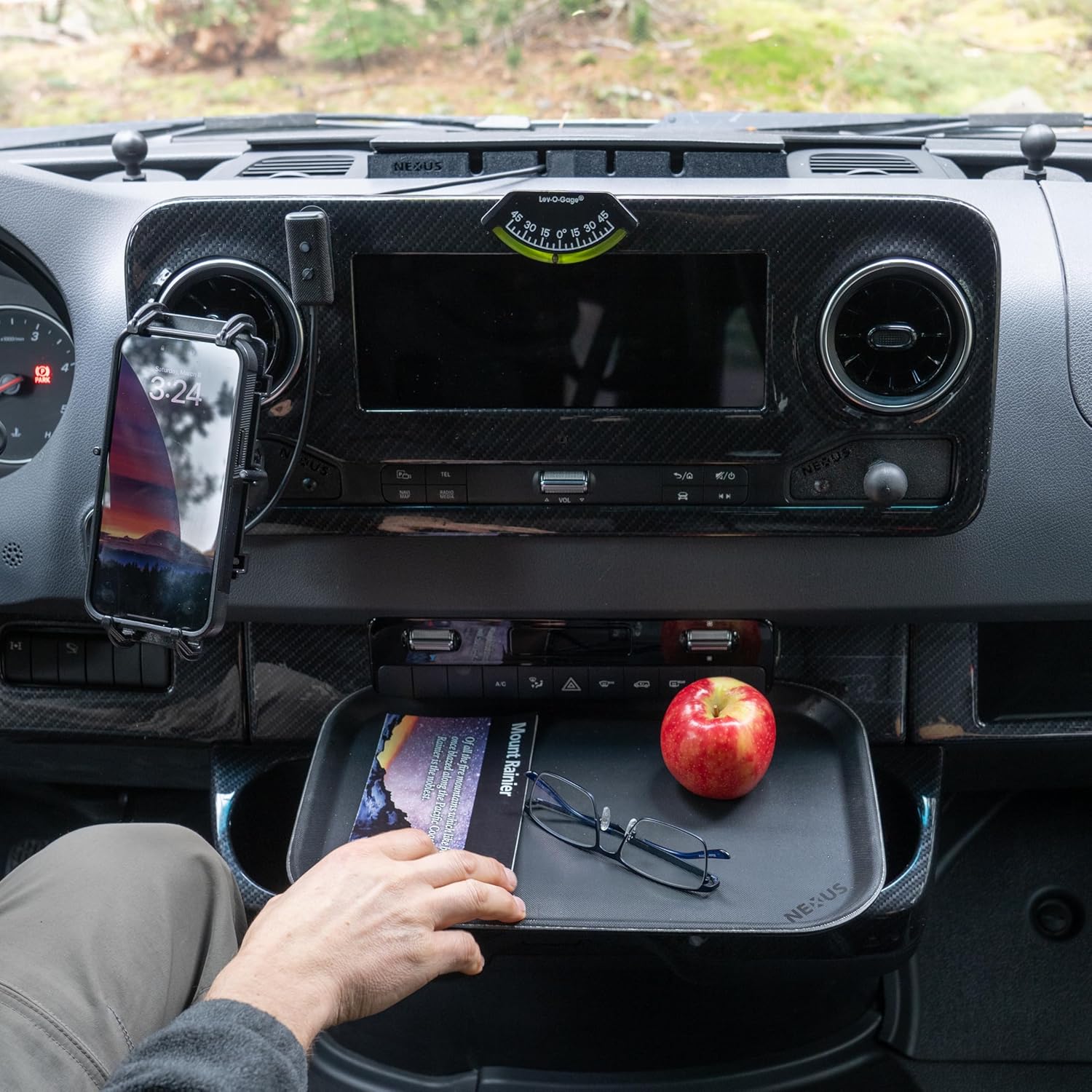 The NEXUS Dash Tray allows convenient placement of items in the Sprinter van accessible from the front seats while driving or parked such as food, snacks, books, maps, glasses, electronic devices and more. Tray measures 10 x 14 inches and features a rubberized anti-skid surface. The Tray may be positioned in the "portrait" or "landscape" orientation and can be moved back and forth for optimal positioning. Tray may be attached or removed in seconds with no tools required and may be stored in the cubby over the driver's seat. Rails underneath the Tray slide into a baseplate which snaps onto a pair of Nexus Cup Adapters (sold separately) placed in the smaller cup holders below the center dashboard. Both larger cup holders remain accessible with Tray in the "portrait" position and one remains accessible in the "landscape" position. Tray in either position allows easy access to the front seats from inside the van and does not block seat rotation. Tray is made from rigid and durable plastic coated with rubber anti-skid surface while Rails and Baseplate are made from tough heat resistant polycarbonate. Compatible with VS30 Mercedes-Benz Sprinter vans including van conversions such as the Winnebago Revel, Storyteller Overland and Jayco Terrain. REQUIRES A PAIR OF NEXUS CUP ADAPTERS, NOT INCLUDED AND SOLD SEPARATELY.