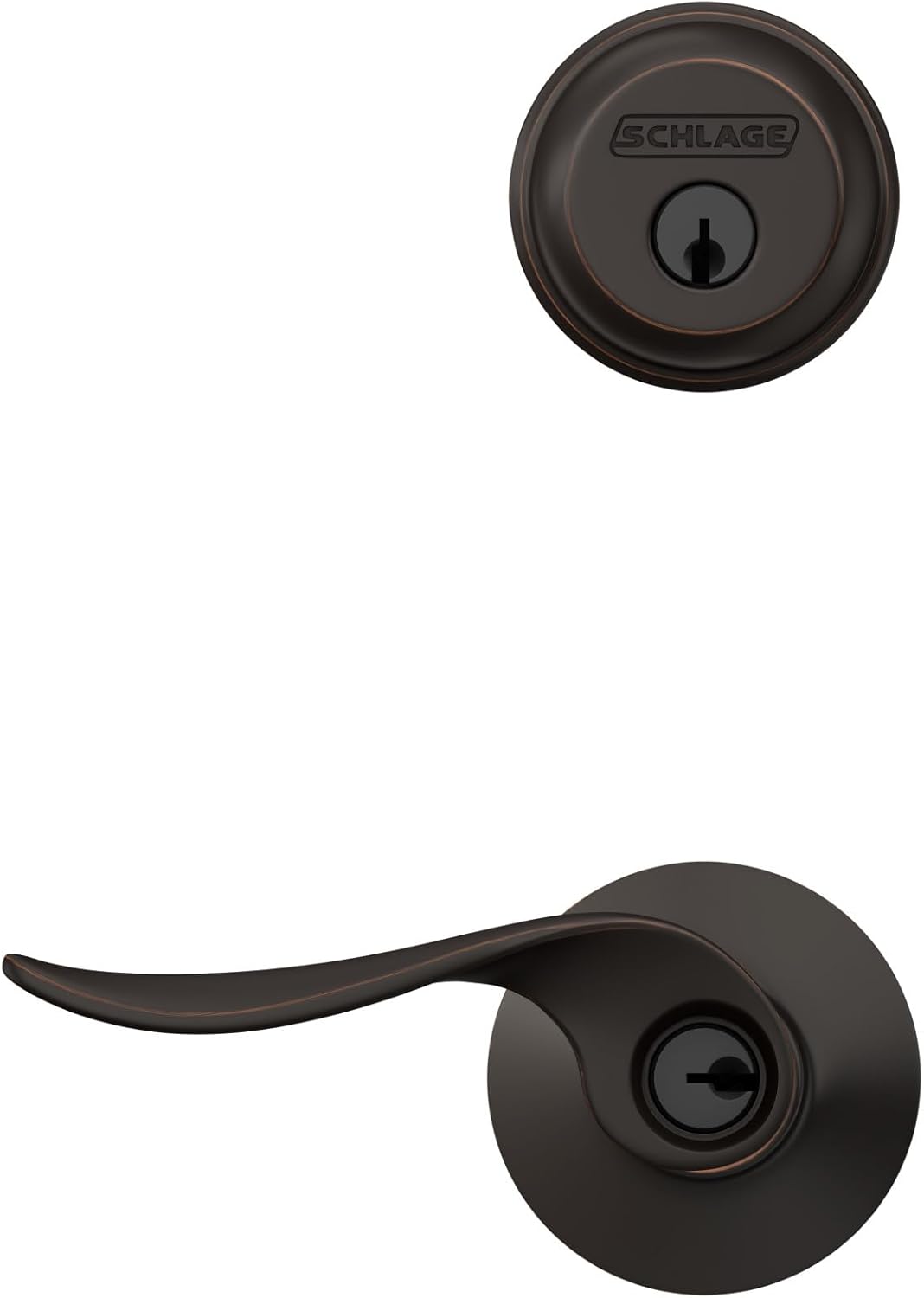 This combo pack includes a single cylinder deadbolt and a keyed knob/lever. The deadbolt locks/unlocks from the exterior with a key and from the interior with a thumbturn; the knob/lever is a locking, keyed function. This product is backed by over a century of dedication to durability, strength and craftsmanship from Schlage. Built with premium materials and certified to the highest industry standards, this deadbolt/door handle combo pack is the finishing touch that makes your house a home. Trust your home to Schlage.