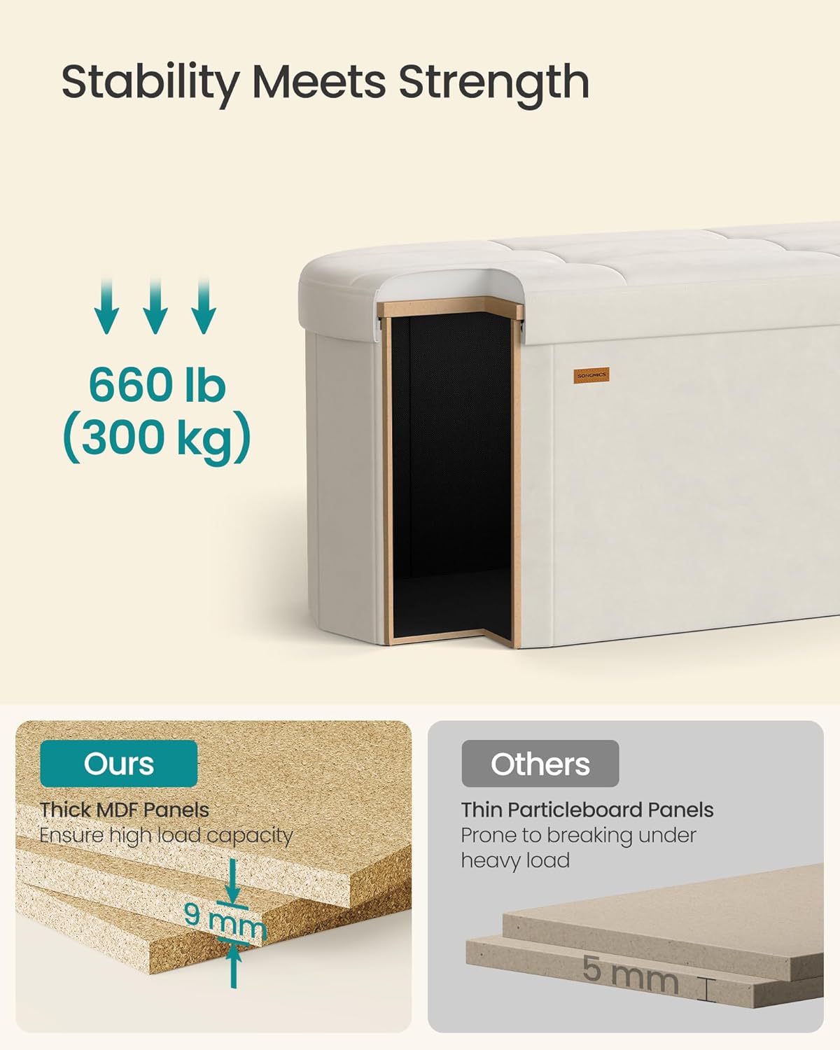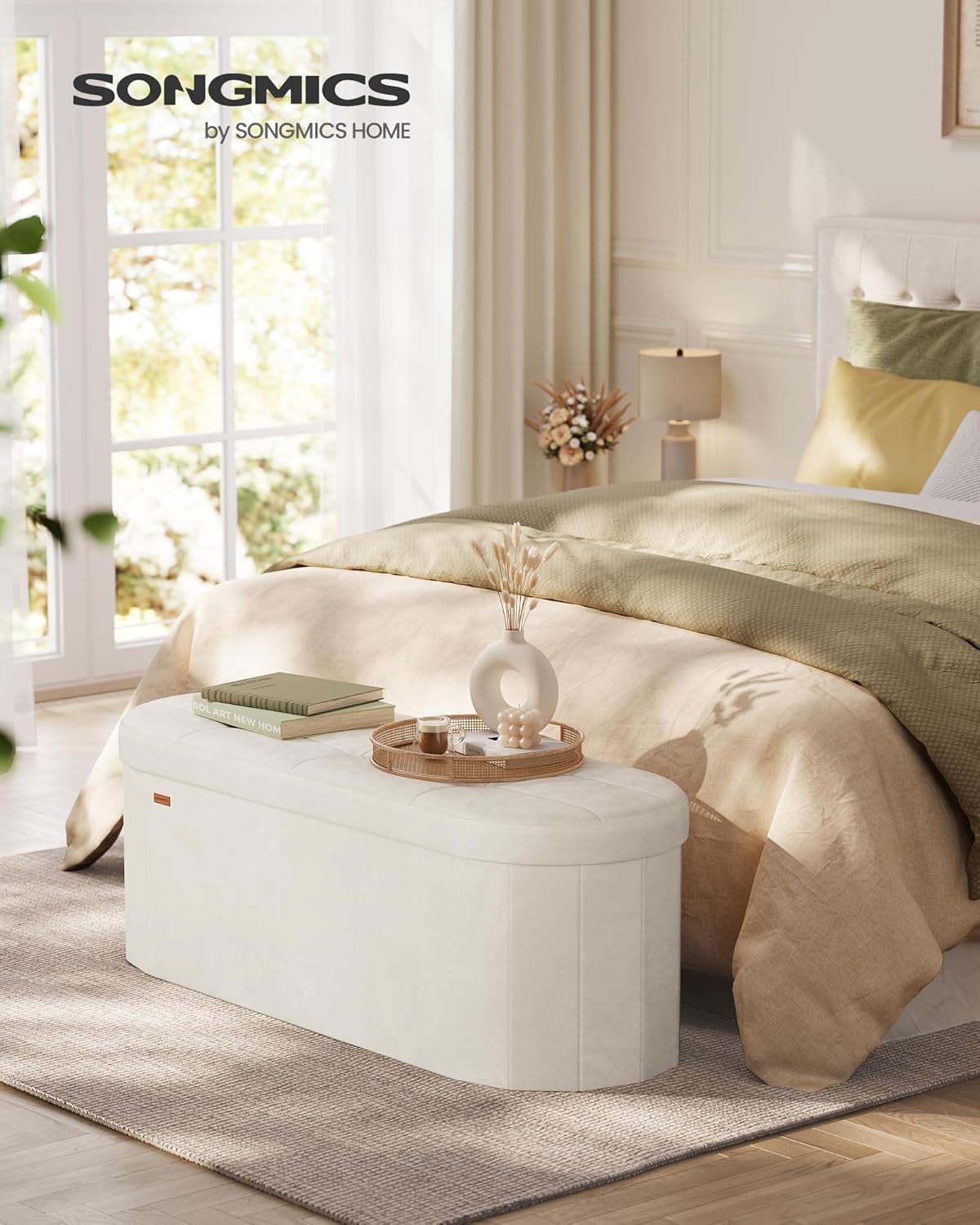 SONGMICS Mazie Collection - Folding Ottoman with Storage, Oval Storage Ottoman Bench, for Living Room, Bedroom, Velvet Fabric, 15 x 43 x 15 Inches, Cream White ULSF297LH01