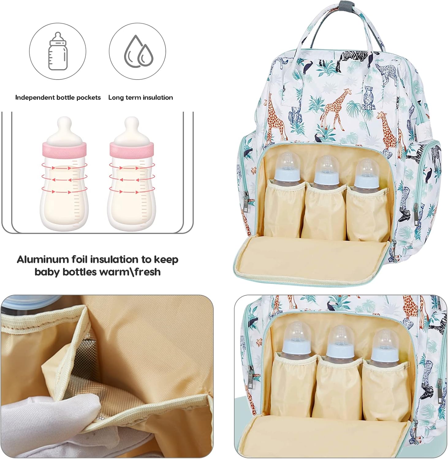 • Large Capacity: Well-organized structure with all sorts of useful pockets. The backpack includes a large capacity main compartment with several internal pockets, a front zipper pocket with 3 insulated bottle pockets to keep baby bottles warm or fresh, and 2 side pockets for easy access to some small items.