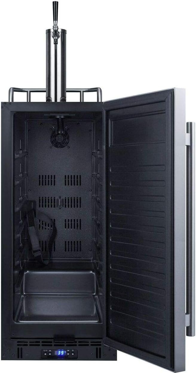 Summit Appliance SBC15CF Built-In 15" Wide Commercially Listed Kegerator with Auto Defrost, Digital Thermostat, Stainless Steel Door, Black Cabinet, Pro Style Handle, Sealed Back and Front Lock Key Features - 15" wide design makes it ideal for smaller residential and commercial settings - Listed to NSF-7 standards and meets UL 471 for commercial use - Designed for built-in installation under the counter - 2.9 cu.ft. interior can accept a 1/6 (sixtel) coffee keg - Commercially approved tap kit includes a stainless steel tower, Nitrogen tank, and regulator - Operates between 34º and 50ºF to keep coffee stored at just the right serving temperature Specifications - Height of Cabinet: 34.25" - Width: 15" - Width with Door Open: 15.25" - Depth: 22.5" - Depth with Handle: 24.5" - Depth with door at 90°: 36.5" - Capacity: 2.9 cu.ft. - Defrost Type: Automatic - Door: Stainless Steel - Cabinet: Black - US Electrical Safety: ETL - Canadian Electrical Safety: ETL-C - Sanitation: ETL-S - Energy Usage/Year: 280.0kWh/year - Amps: 1.25 - Voltage/Frequency: 115V AC/60Hz - Door Swing: RHD - Reversible: Yes - Tap Kit: Yes - Height with Tap: 49.75" - Number of Taps: 1 - Adjustable Shelves: Yes - Shelf Type: Chrome - Shelf Qty: 2 - Thermostat Type: Digital - Fan Type: Exterior - Refrigerant: R600a - Refrigerant Amount: 1.06 oz. - High Side PSI: 150 - Low Side PSI: 50 - Interior: 26.75"x11.75"x17.5" - Compressor Step: 3.75"x11.75"x5" - Level Legs Qty: 4 - Wheel Qty: 4 - Temperature Range: 34º to 50ºF - Weight: 78 lbs. - Shipping Weight: 84 lbs.