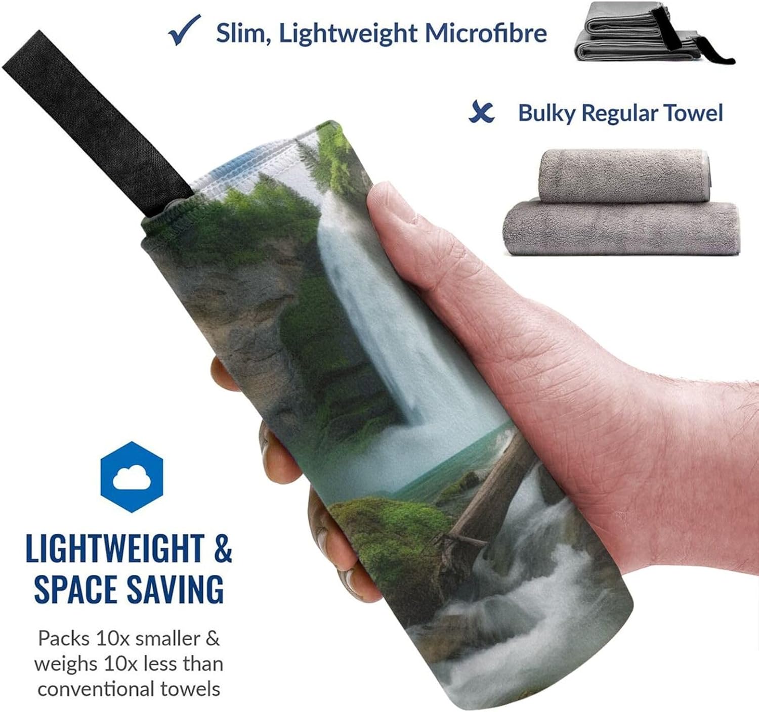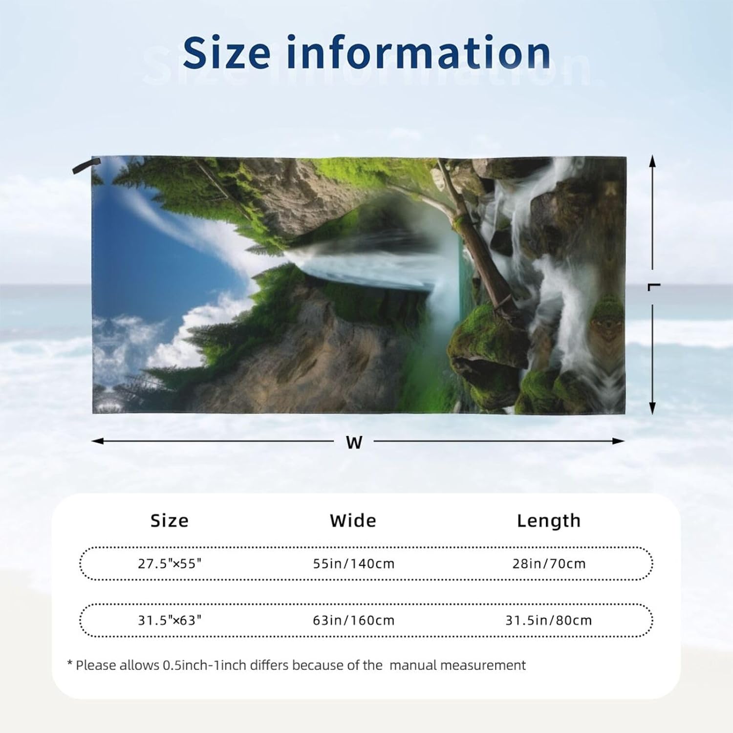 Waterfall View Quick Dry Towel.Design:Full Width Single Side Printing.Material:Microfiber Material.Product Performance:Our Beach Towels Are Made Of Soft Microfiber,Smooth And Compact,With Better Water Absorption Than Ordinary Towels,This Quick-Drying Fabric Has Excellent Performance In Absorbing And Diffusing Water,Which Can Shorten The Drying Time Of Water.The Towel Comes With A Special Bag And Climbing Buckle For Easy Packing And Hanging,And Can Be Hung Anywhere For Quick Air Drying.Ultra-Lightweight And Ultra-Compact,The Towel Can Easily Be Placed In A Gym Bag Or Backpack.Climbing Buckle On The Pouch For Attaching Or Fitting Into Your Bag.Foldable Design Makes It Easy To Fold Into A Travel Bag,Store In Your Suitcase Or Backpack.The Gift Bag Is Also Suitable For Storing Cell Phones,Wallets,Sunglasses,Goggles,Swim Caps,Etc.Most Suitable For Sports,Travel Enthusiasts.Applicable Scenes:Outdoor Camping,Hiking,Beach,Travel,Gym,Home Use Are Available.Accessories:Towel With Hanging Buckle Webbing,Easy To Hang Air Dry,Pvc Bags,With Climbing Buckle,Easy To Store And Carry.Washing Instructions:Machine Washable,Wash Before First Use,Just Hand Wash Or Machine Wash,Air Dry.Please Do Not Bleach.